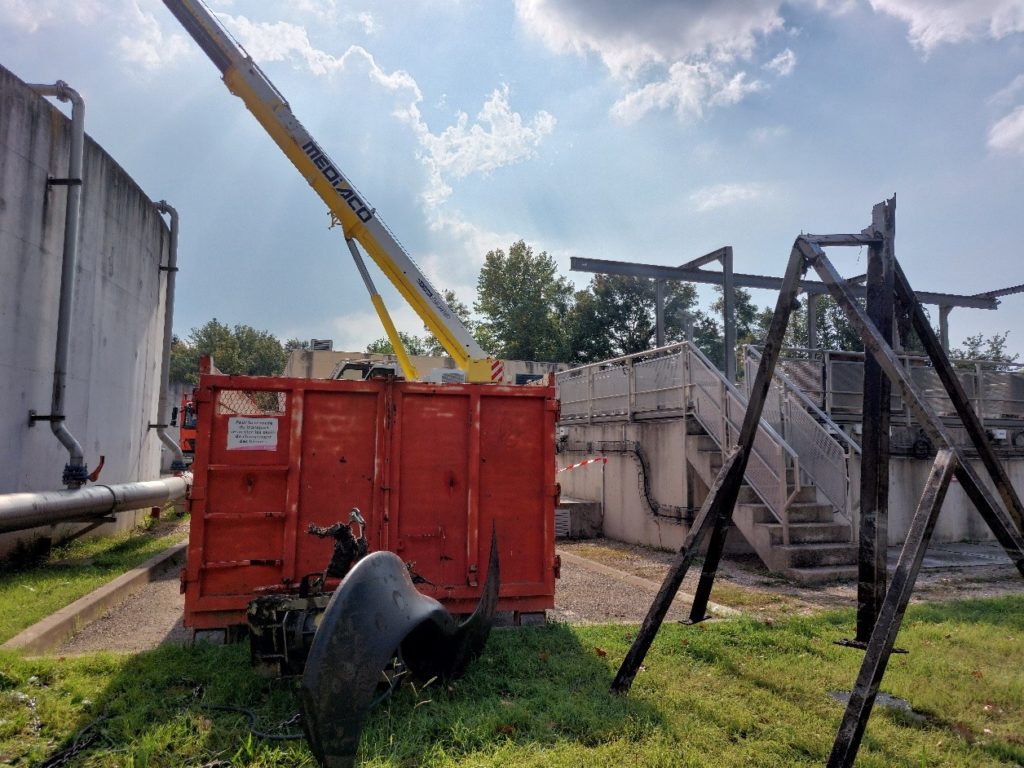 Au fil des années de fonctionnement, l’agitateur du bassin, équipé d’hélices assurant la mise en mouvement et le sens du flux, avait montré des signes d’usure avancée. Par ailleurs, les raquettes de diffusion, qui permettent à l’air surpressé d’être injecté dans le bassin d’aération sous forme de microbulles, nécessitaient également une remise en état. Ce système de micro diffusion optimise le contact entre l’air et l’effluent, favorisant ainsi une oxygénation efficace indispensable au bon déroulement du traitement biologique.